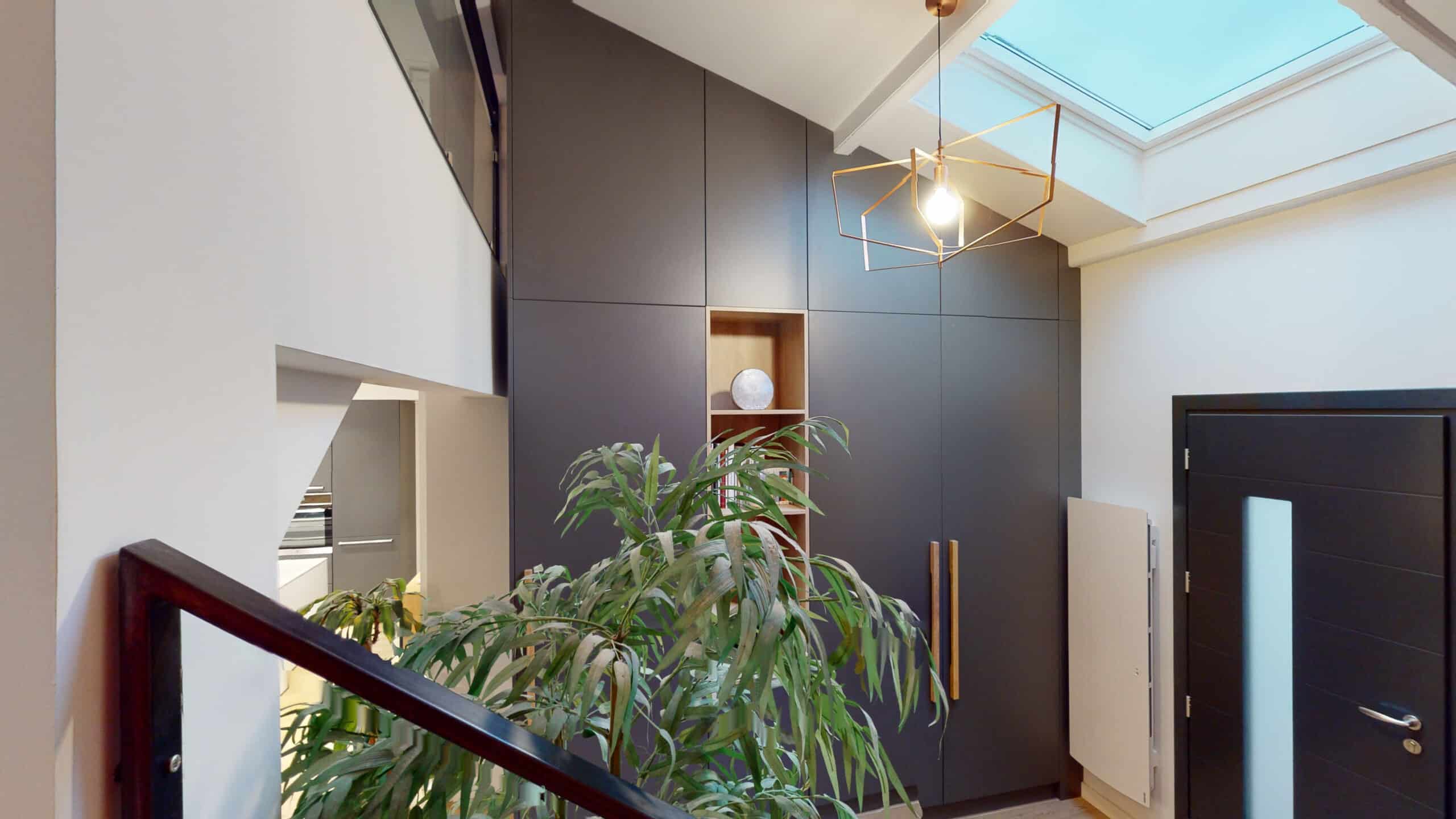 Pour structurer les zones sans cloisonner, notre architecte a conçu des jeux de faux plafonds avec décrochés et corniches lumineuses à LED. Puis, côté escalier, les anciens garde-corps en bois ont été remplacés par une création unique en métallerie et vitrage. Celle-ci a été réalisée par notre ferronnier d’art. De plus, dans l’entrée, un ensemble de mobilier fixe fabriqué par notre ébéniste vient souligner l’élégance de l’accueil.