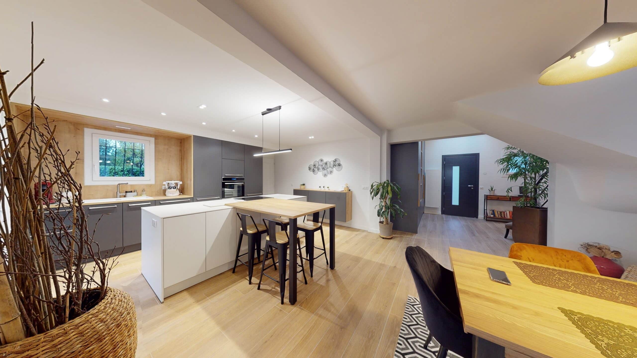 La première étape de cette rénovation complète de maison a consisté à libérer l’espace. Ainsi, nous avons procédé à l’abattement d’un mur porteur entre la cuisine et la salle à manger. Nous avons alors créé une pièce de vie fluide et conviviale.